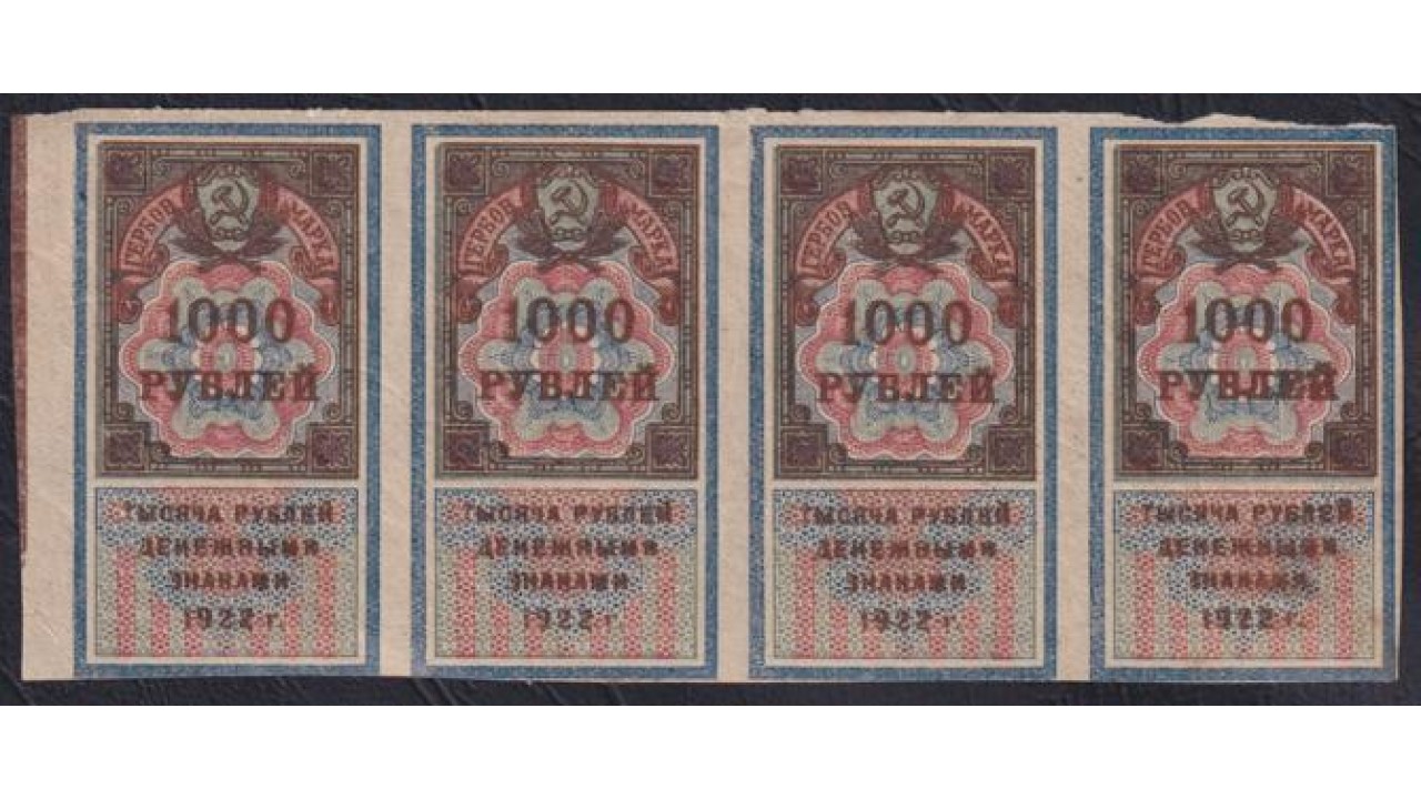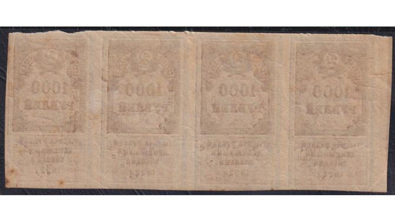 • Акцизная Гербовая Марка 1000 рублей 1922 г., сцепка из 4 штук (Excise Stamp 1000 rubles 1922)  : XF/aUNC