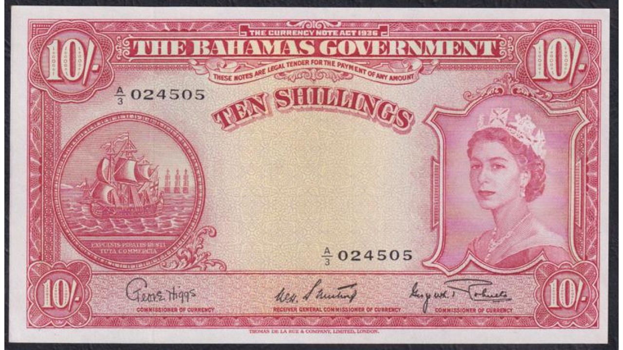 • Багамские Острова 10 шиллингов L.1936(1953) года, РЕДКИЕ (BAHAMAS 10 Shillings Bahamas Government L. 1936 (1953)) P 14d: UNC