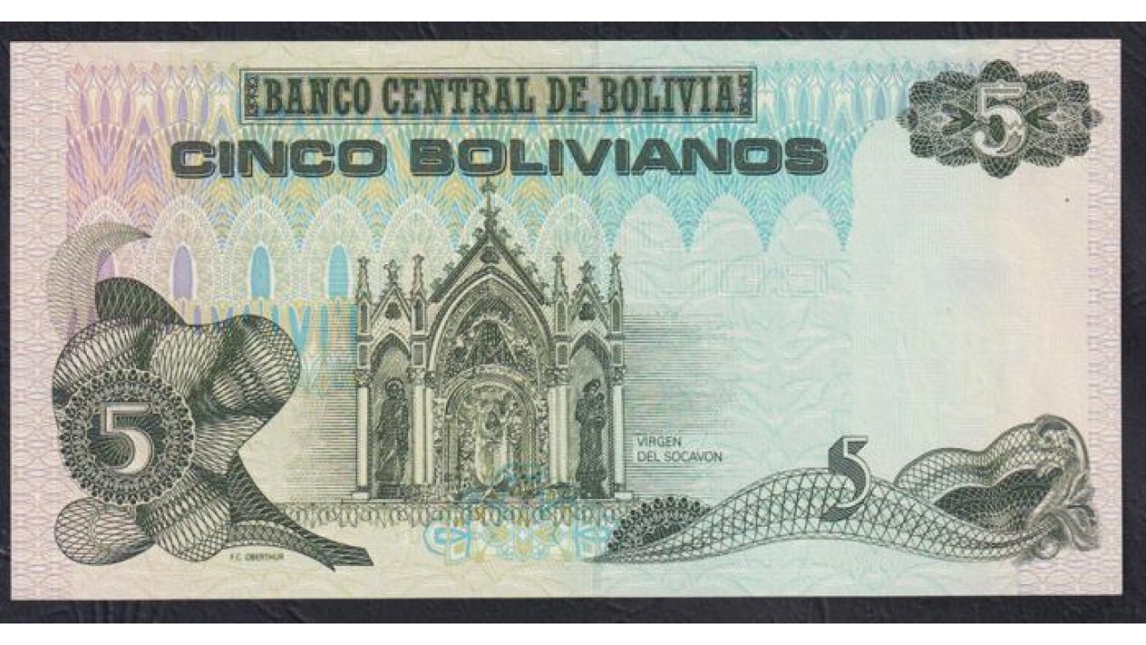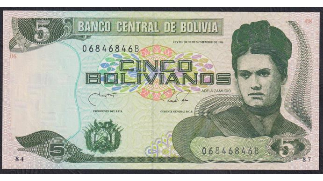 Боливия 5 боливиано 1986 года, Cерия B 06846846, Прикольный номер, РЕДКИЕ (BOLIVIA 5 bolivianos 1986) P 203b: UNC