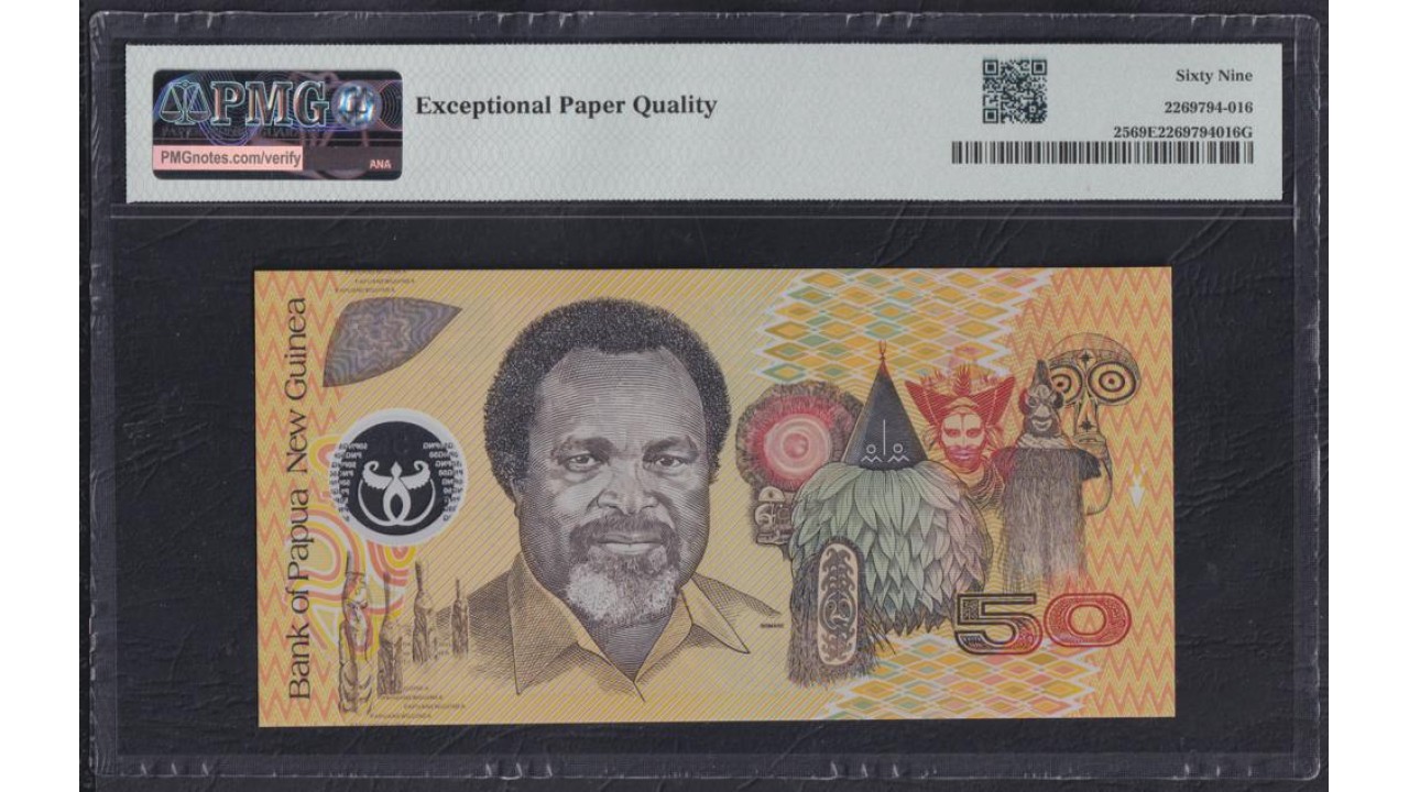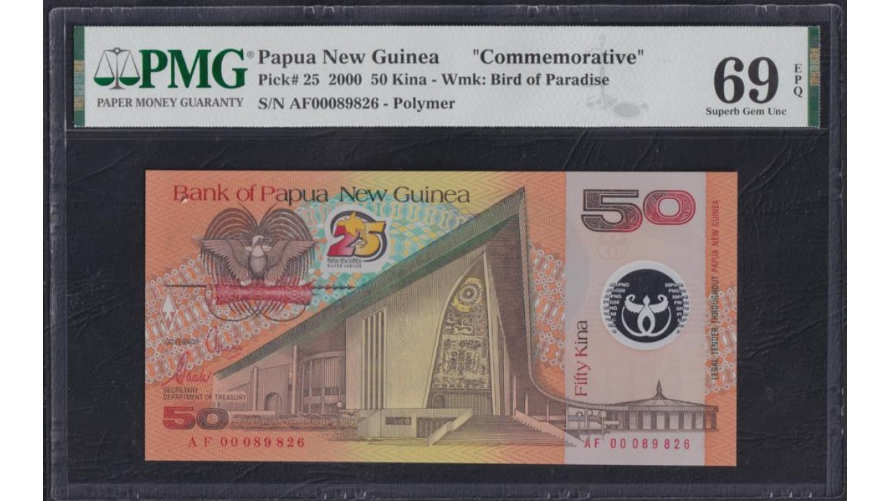 Папуа Новая Гвинея 50 кина 2000, Серебряный Юбилей Государства Папуа Новая Гвинея, Полимер, КРАЙНЕ РЕДКИЕ(Papua New Guinea 50 Kina 2000, Silver Jubilee of Papua New Guinea (1975-2000), Polymer plastic, RARE) P 25: PMG 69 EPQ Superb Gem UNC, TOP POP!!!