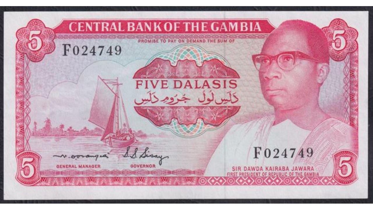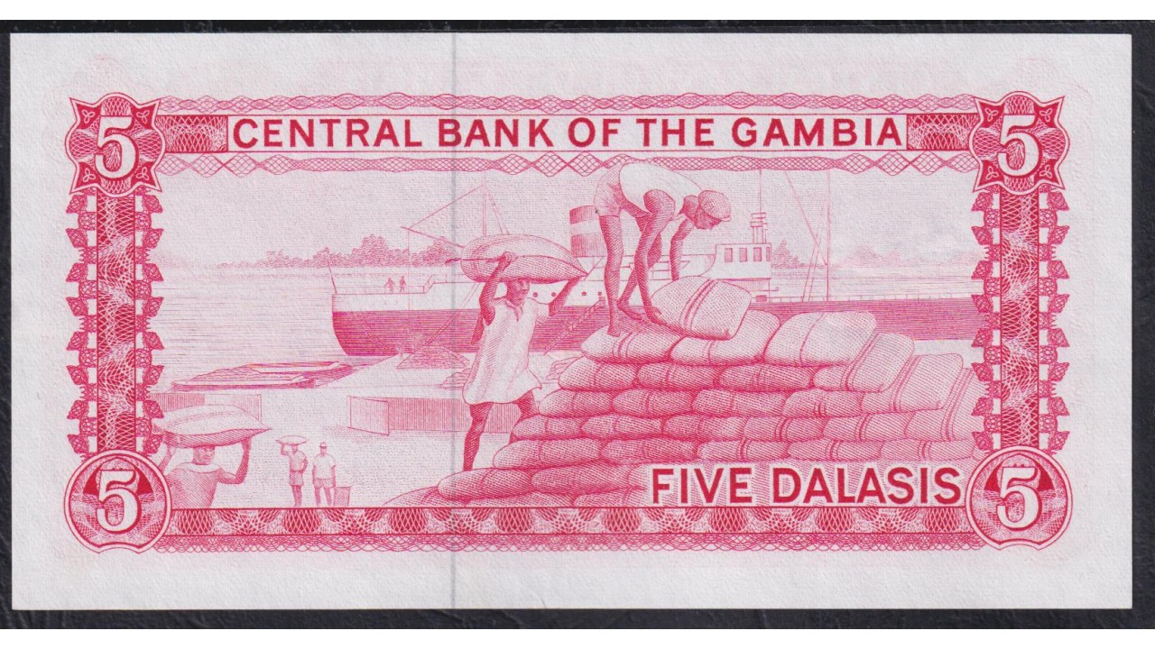 • Гамбия 5 даласи (1972-86) F024749 (Gambia 5 dalasis (1972-86)) P 5b: aUNC
