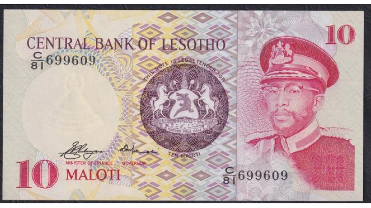 Лесото 10 малоти 1981 года, C/81 699609, РЕДКИЕ (Lesotho 10 maloti 1981) P 6a: UNC