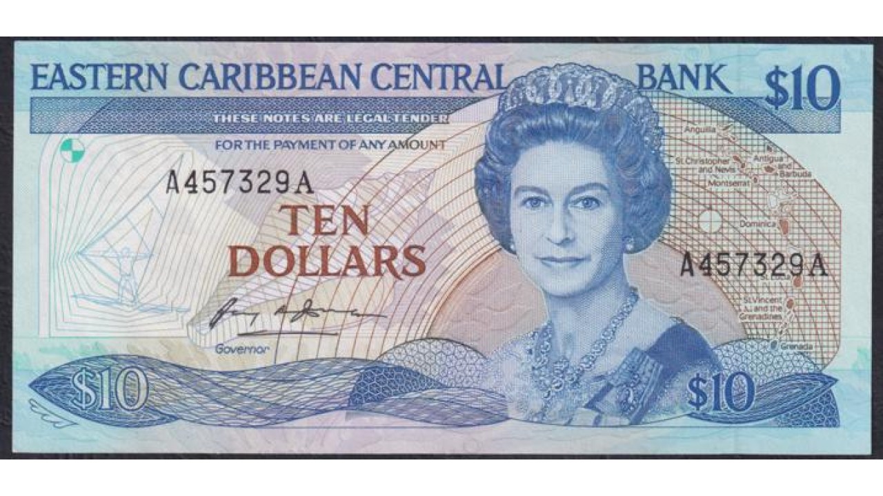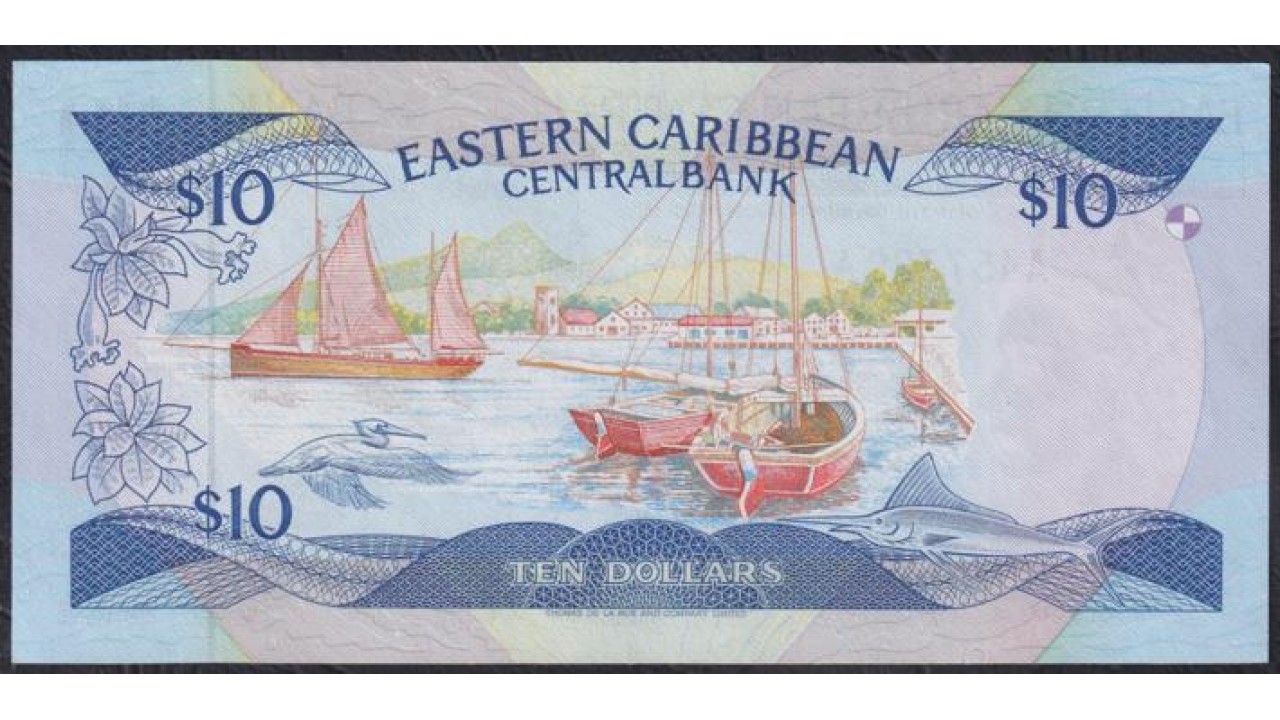 Восточные Карибские Острова 10 долларов ND (1985-1993) Антигуа (EAST CARIBBEAN STATES 10 Dollars ND (1985-1993) Antigua) P 23a (1): XF++