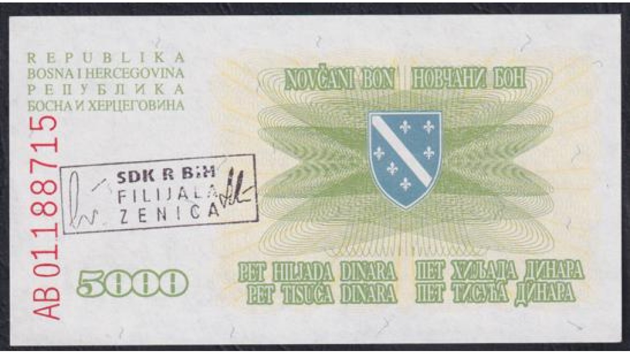 Босния и Герцеговина 5000 динар 1993 год, Штамп: Зеница (BOSNIA & HERZEGOVINA 5000 Dinara 1993, Stamp Zenica ) P16b(1): UNC