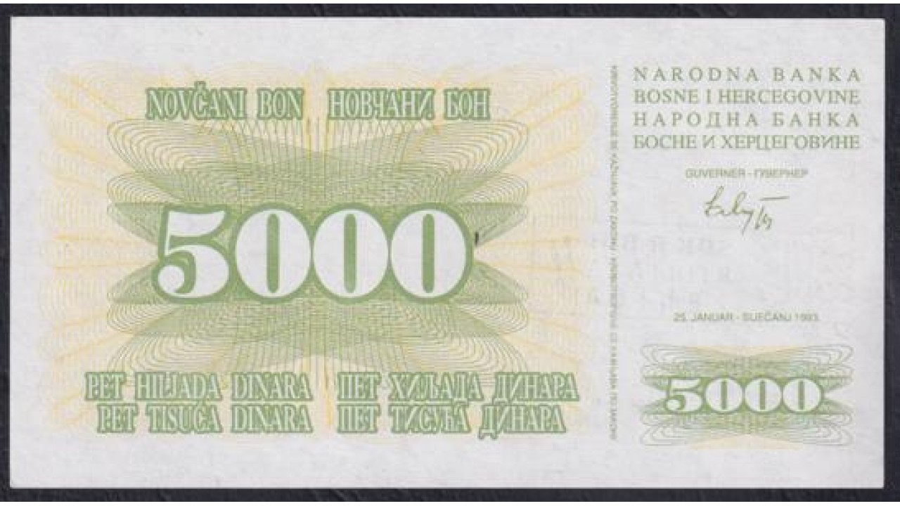 • Босния и Герцеговина 5000 динар 1993 год, Штамп: Зеница (BOSNIA & HERZEGOVINA 5000 Dinara 1993, Stamp Zenica ) P16b(1): UNC