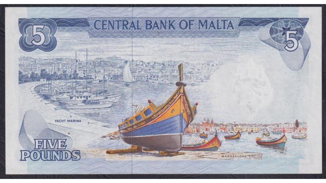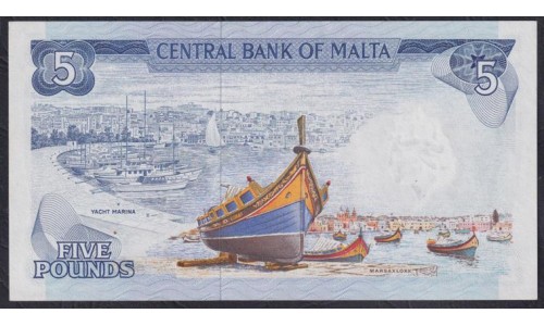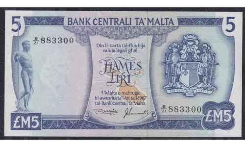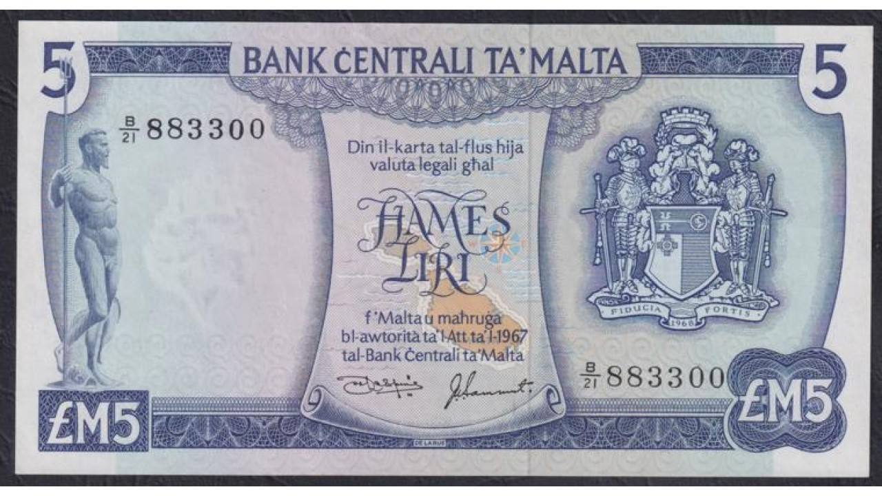 Мальта 5 лир 1973 года, КРАСИВЫЙ НОМЕР 883300 (MALTA 5 Liri 1973) P32c: UNC