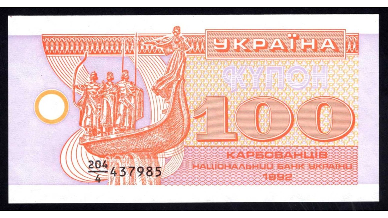 • Украина 100 карбованцев 1992 г. (UKRAINE 100 Karbovantsiv 1992) P88: UNC