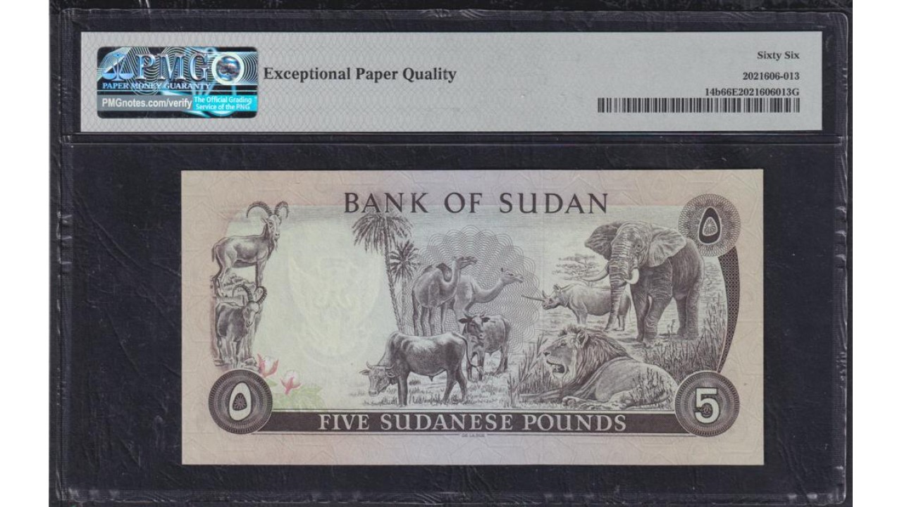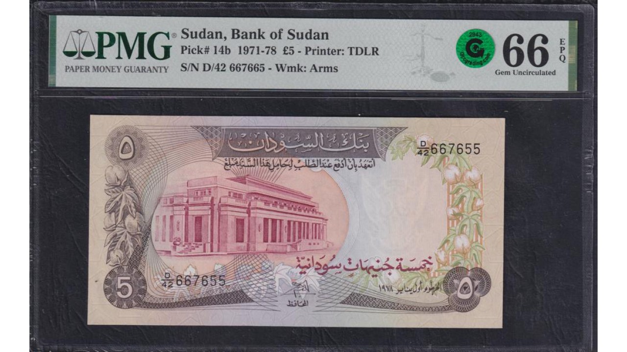 Судан 5 фунтов 1971-78 год, РАРИТЕТ, принтер TDLR (SUDAN 5 pounds 1971-78, Printed TDLR) P 14b: PMG 66 Gem UNC EPQ