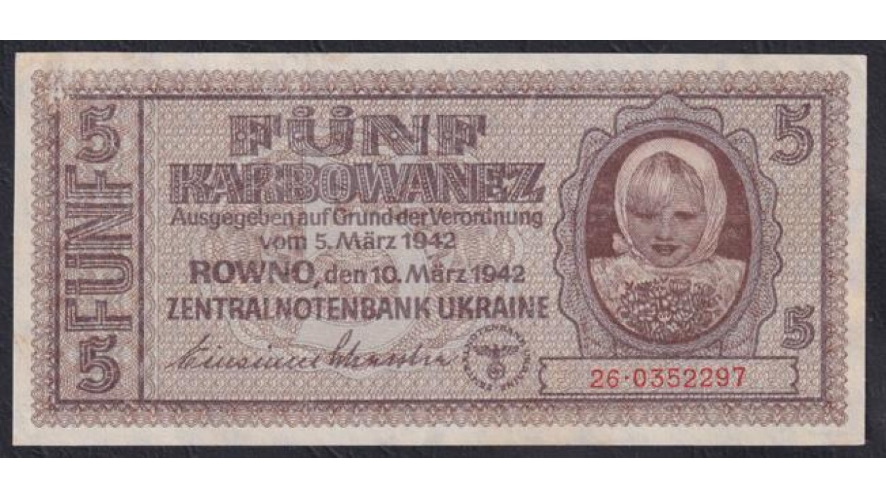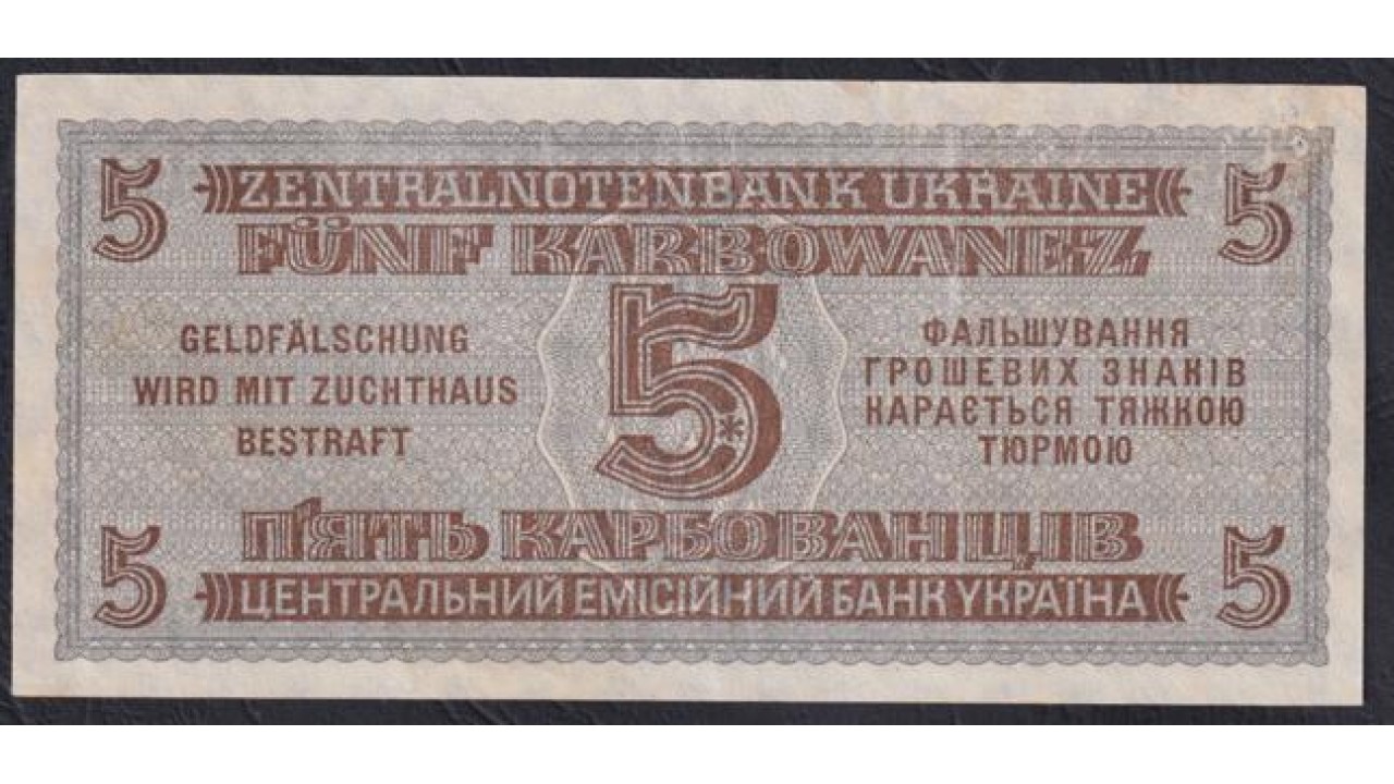 • Украина СССР фашистская оккупация 5 карбованцев 1942 года, Ровно, 22.0466136 (5 Karbowanez Zentralnotenbank Ukraine 10.03.1942, ROWNO) P 51: aUNC