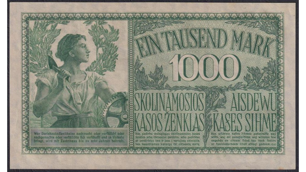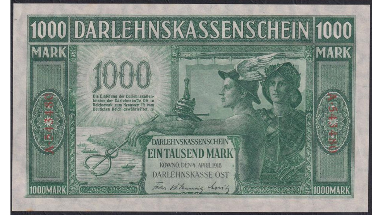 • Литва 1000 марок 1918 года, Ковно - Каунас, A.543480 (Lithuania 1000 mark 1918, KOWNO) P R134a: UNC