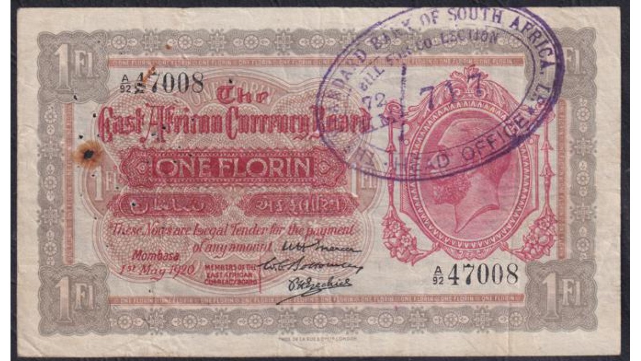 Британская Восточная Африка 1 флорин 01.05.1920, Штамп Южно-Африканского Банка, РАРИТЕТ (EASTAFRICAN CURRENCY BOARD 10 Florin 01.05.1920) P 8: VF
