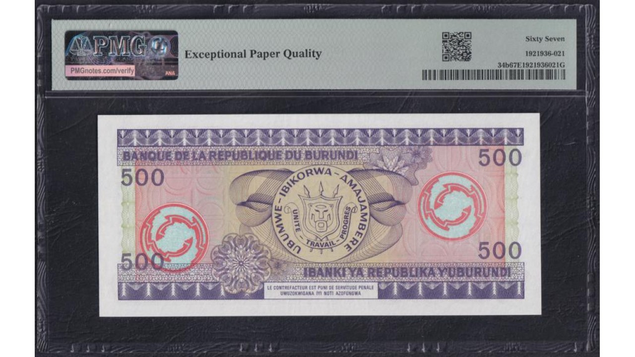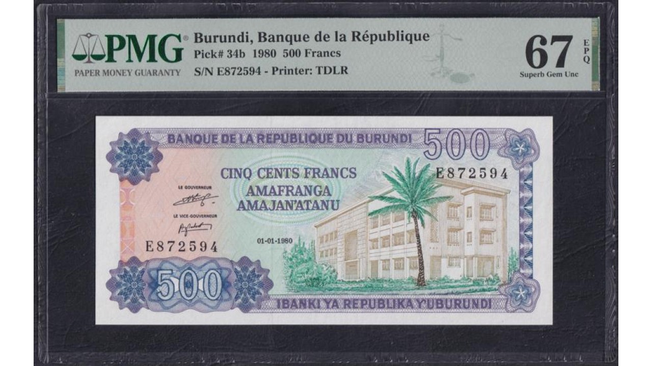 Бурунди 500 франков 1980 год, Крайне Редкие (Burundi 500 francs 1980) P 34c: UNC PMG 67 Superb GemUNC EPQ