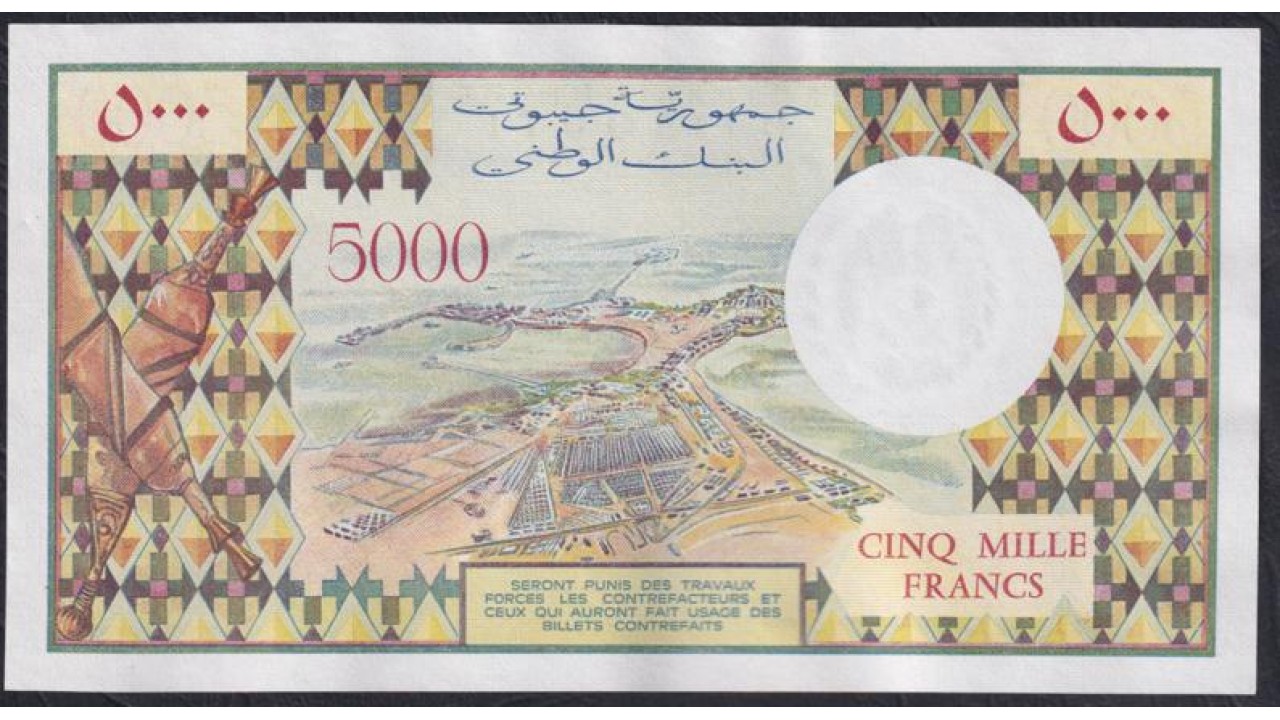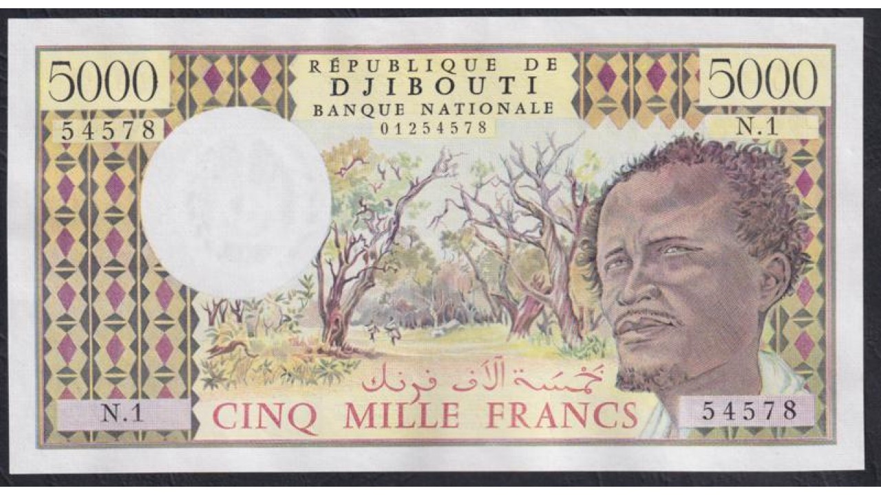 • Джибути 5000 франков (1979-2002), РЕДКИЕ (Djibouti 5000 francs (1979-2002)) P 38a: UNC--(Без перегибов, загибов и заломов)