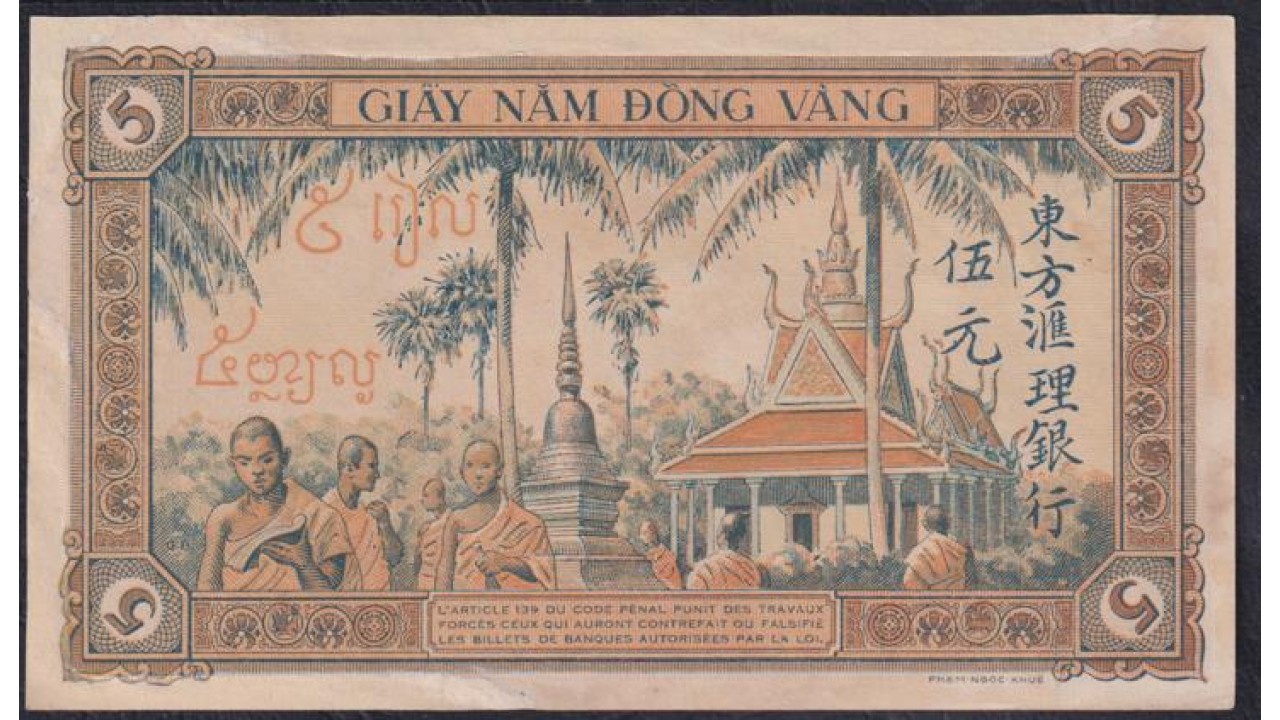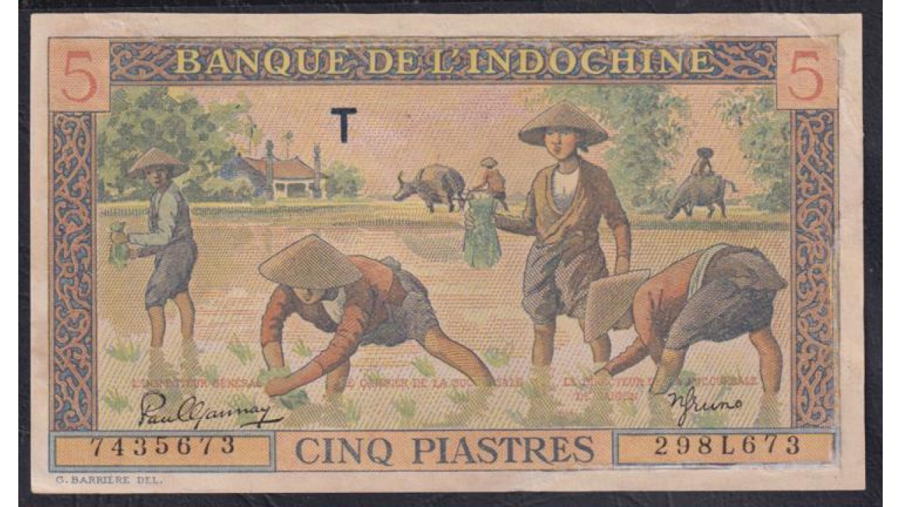 • Французский Индо-Китай 5 пиастров  б/д (1944), напечатаны в Японии, Классическая Редкость!!!  (FRENCH INDOCHINA 1 piastres ND (1944) Printed Japan) P 75: aUNC/UNC