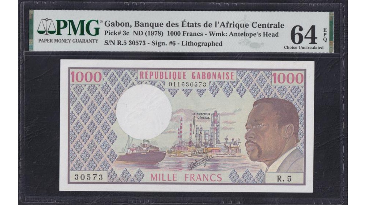 • Габон 1000 франков 1978 года (Gabonaise 1000 francs 1978) P 3c: PMG 64 Choice UNC EPQ