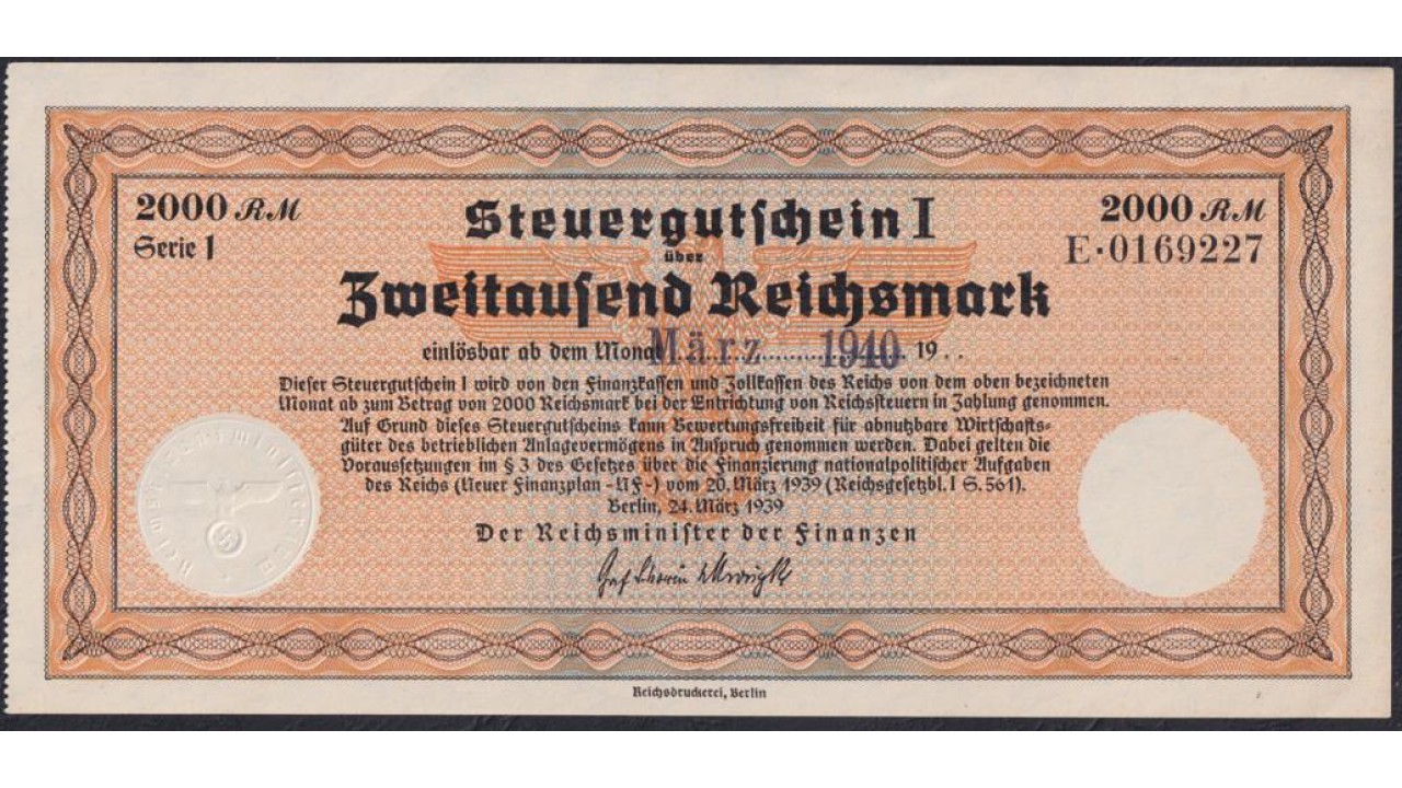 Согласно Финансовой программе от 20.03.1939, были введены «налоговые чеки» (Steuergutscheine) для покрытия растущих государственных расходов (особенно на вооружение и наращивание военной мощи), с помощью которых Рейх, земли и муниципалитеты, Рейхсбан и Рейхспост, Рейхсавтобанская компания и другие компании, утвержденные Министерством финансов, могли производить платежи за поставки и услуги, полученные частными компаниями, в размере до 40% (из которых половина оплачивалась в чеках Steuergutscheinen I, а другая половина — в чеках Steuergutscheinen II). Чеки
