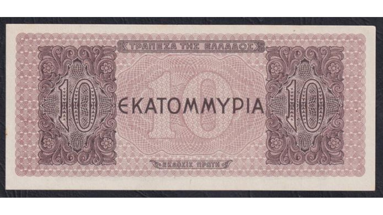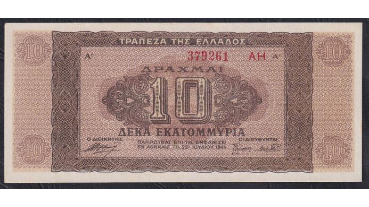 Греция 10 миллионов драхм 1944 года, AH (GREECE 10000000 Drachmai 1944) P129b: UNC-