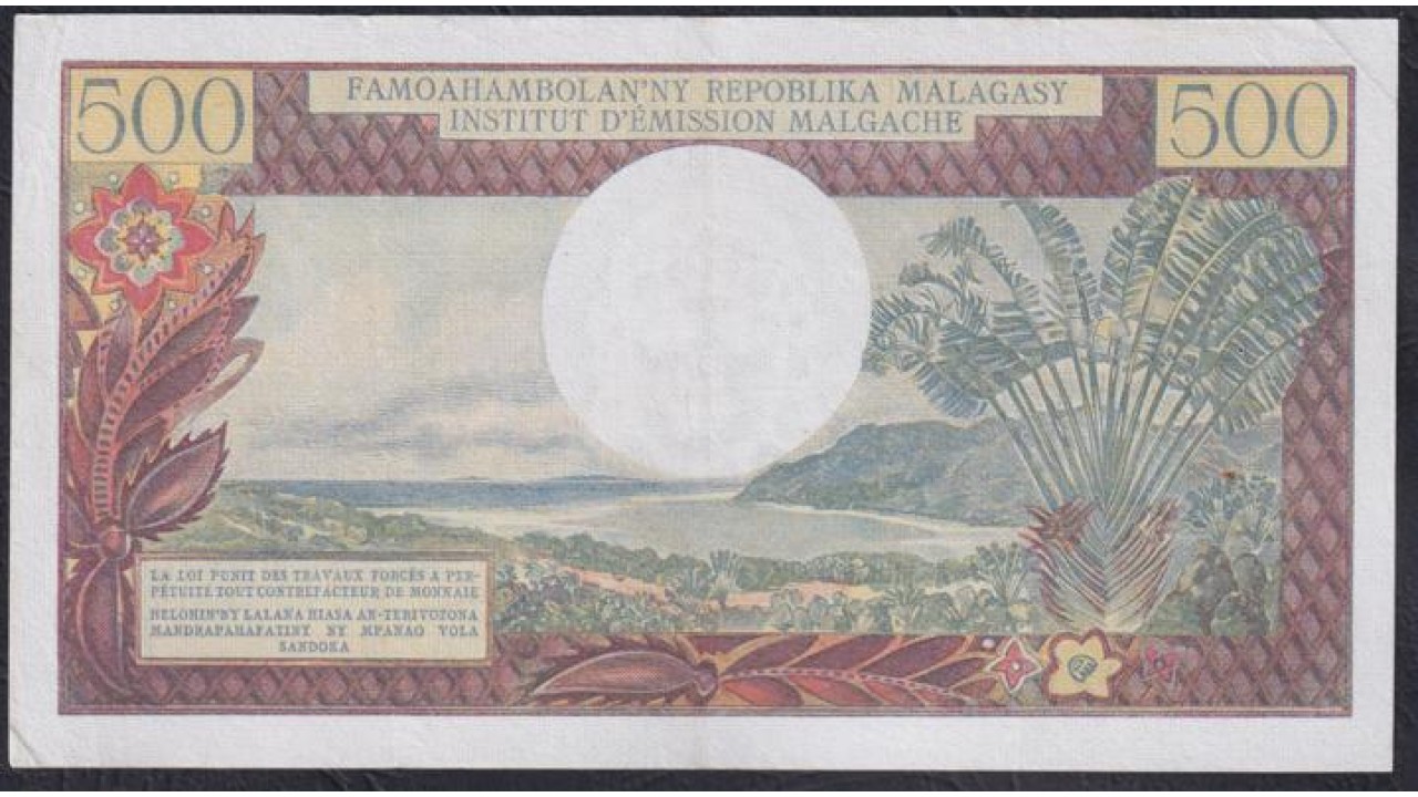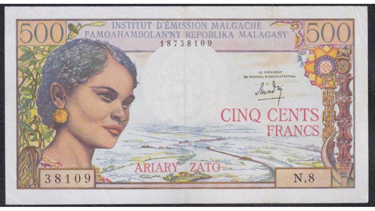 Мадагаскар 500 франков = 100 ариари 1966 года, Нечастые (MADAGASCAR 500 francs =100 ariary 1966) P 58a(1): VF/XF