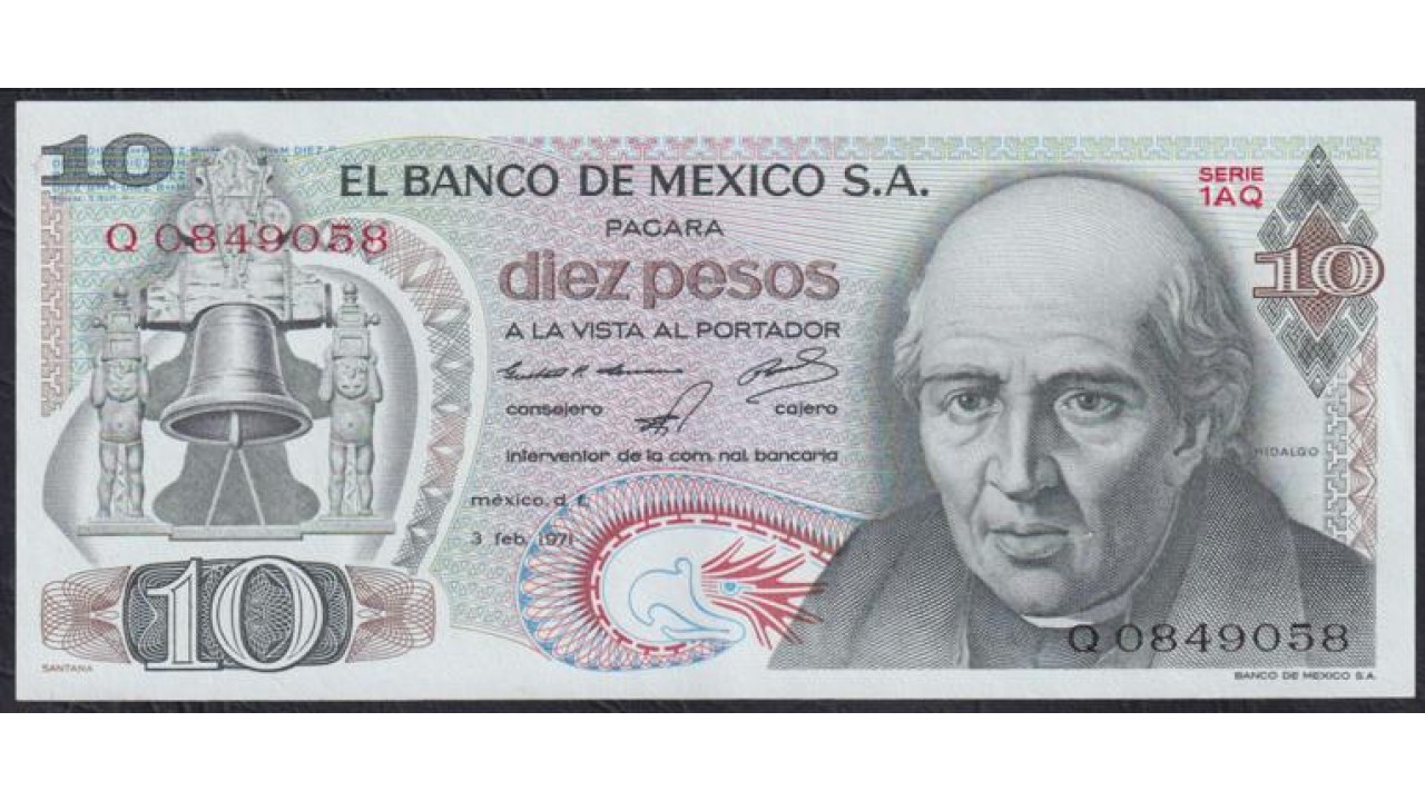 • Мексика 10 песо 1971 года, Серия 1AQ (MEXICO 10 Pesos 1971) P 63d(1) : UNC