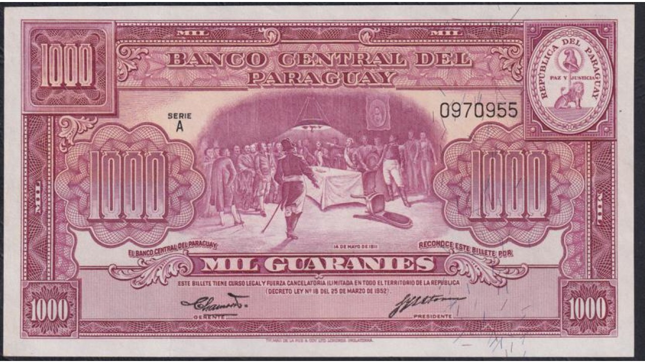 Парагвай 1000 гуарани 25.03.1952 года, 0970955, НЕЧАСТЫЕ (PARAGUAY 1000 Guaranís 1952) P 191b: UNC