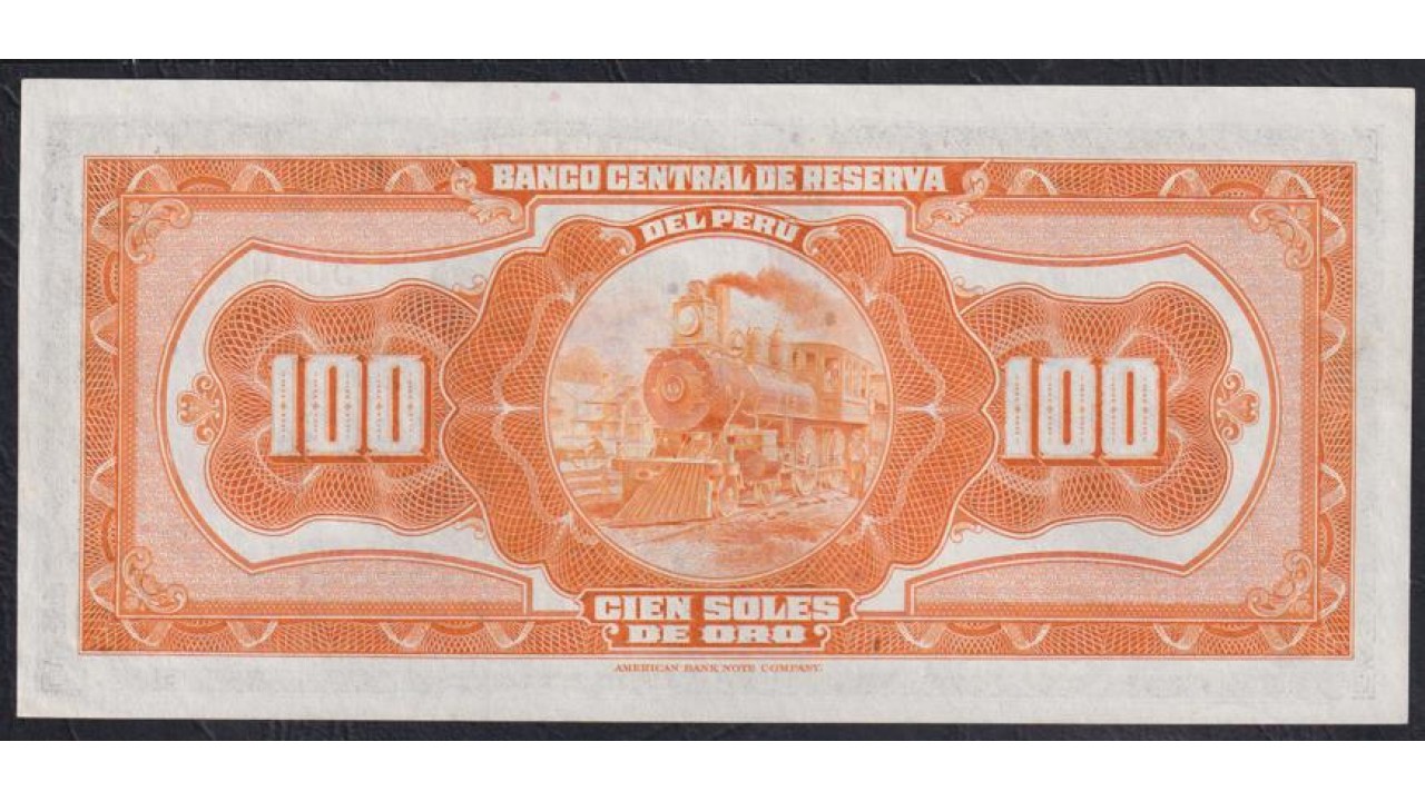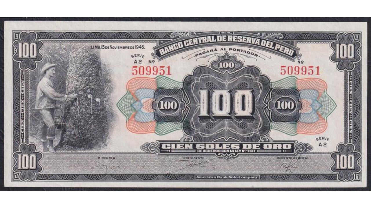 Перу 100 солей 1946 года, РЕДКИЕ (PERU 100 Soles de Oro 1946) P 69А(4): UNC-