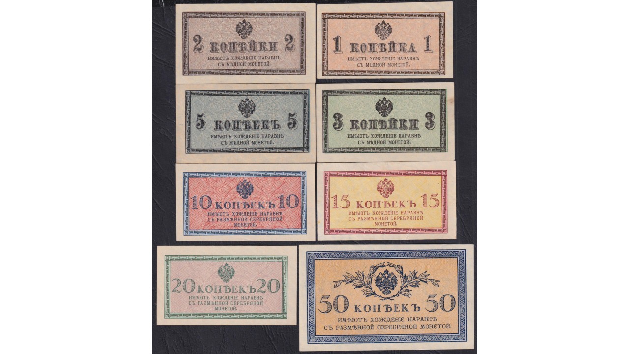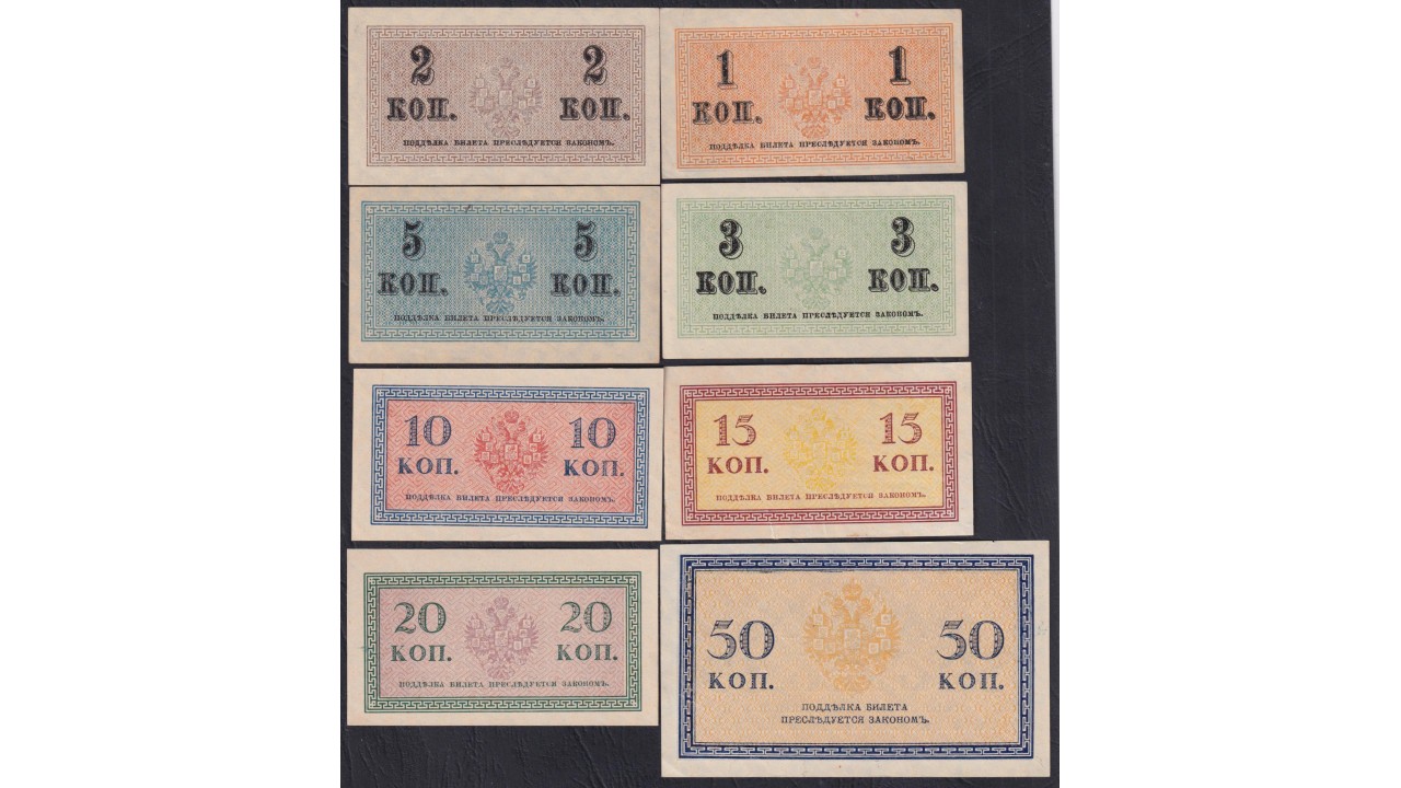 Россия, полный комплект казначейских билетов от 1 копейки до 50 копеек 1915-17 года (1-50 kopeks 1915-17) P 24-31: UNC-/UNC