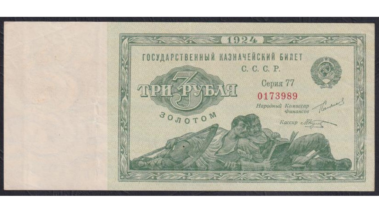 • Россия СССР 3 рубля золотом 1924 года Ленивцы-Лежебоки", кассир Козлов, Серия 77, 0173989 (3 Gold Rubles 1924) P 187a(2): XF