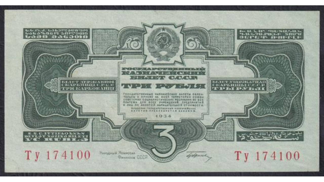 Россия СССР 3 рубля золотом 1934 года, Подпись НКФ Гринько, Ту 174100 (3 Gold Rubles 1934) P 209: UNC