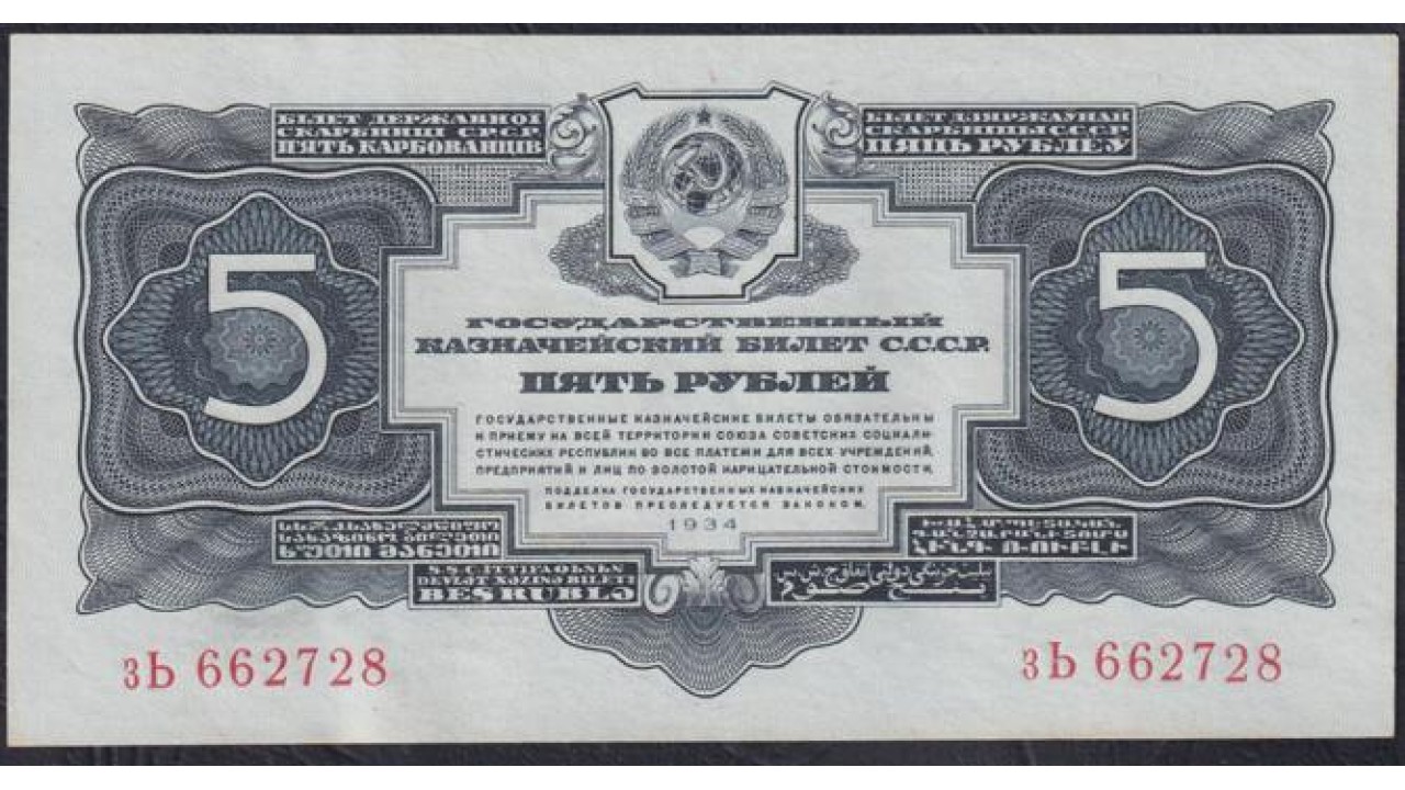 • Россия СССР 5 рублей золотом 1934 года без подписи, зЬ 662728 (5 Gold Rubles 1934) P 212: aUNC/UNC
