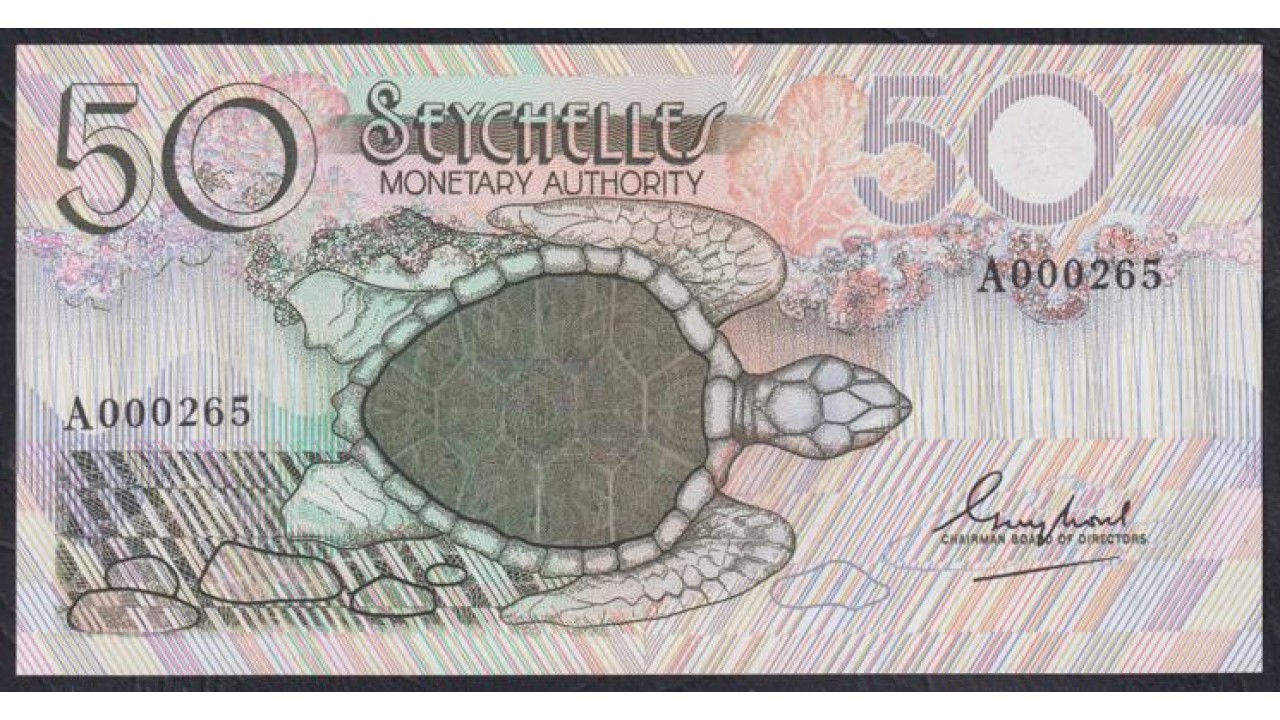 Сейшельские Острова 50 рупий 1979 год, Короткий Номер A 000265 (Seychelles 50 rupees ND (1979) P 25: UNC