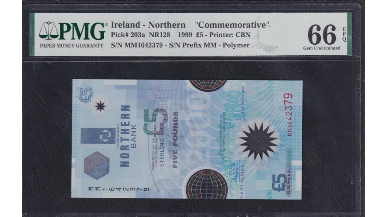 Северная Ирландия 5 фунтов 1999 года, MM 1642379 (Northen Ireland 5 Pounds 1999, mm 1642379) P 203a : PMG 66 Gem Uncirculated EPQ