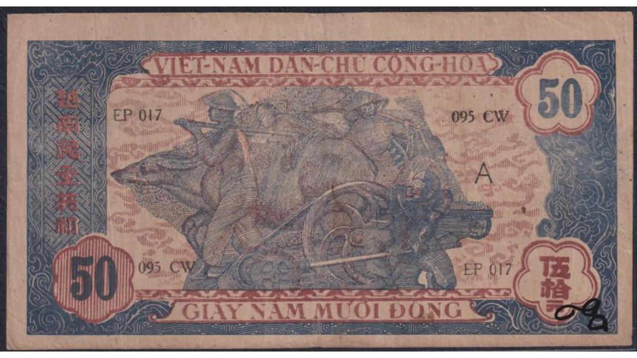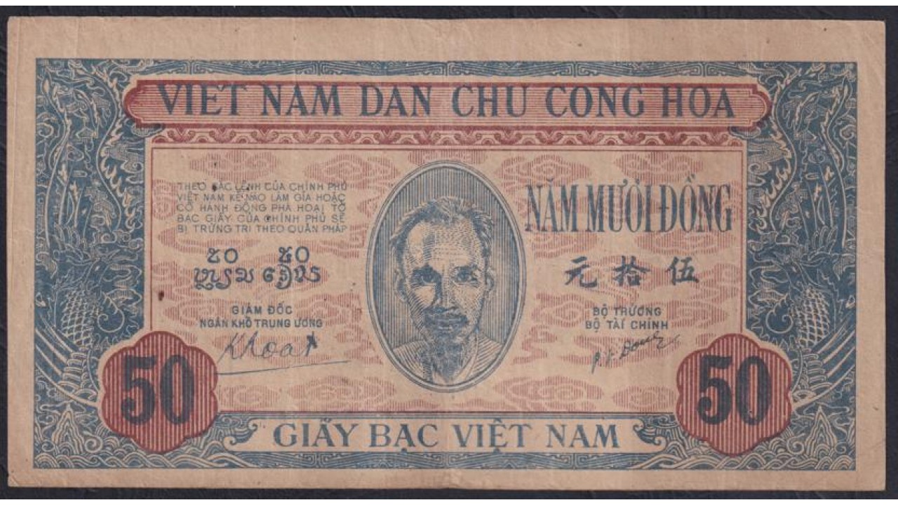 • Северный Вьетнам 50 донг ND(1947), В/З Овал с Вьетнам (North Vietnam 50 dong ND(1947) watermark: oval with "VIETNAM") P 11c XF
