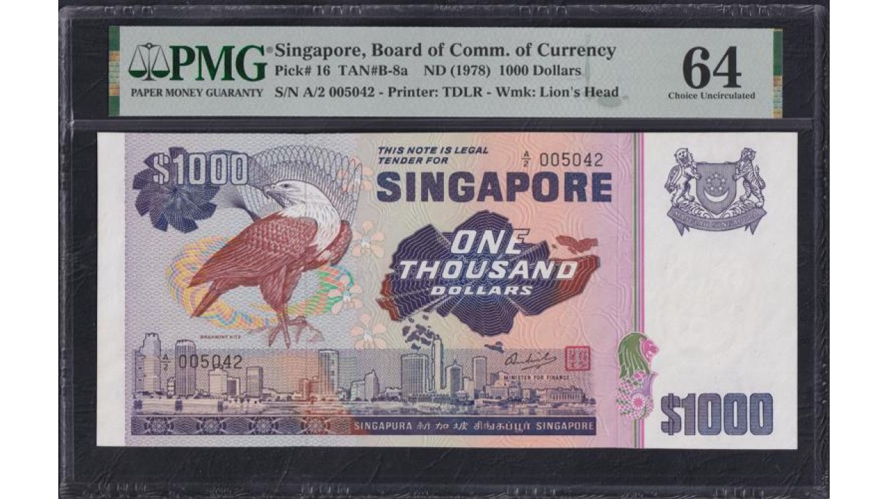 Сингапур 1000 долларов б\д (1978) А/2 005042, Редкие в состоянии UNC (Singapore 1000 dollars ND (1978)) P 16: UNC PMG 64 Choice Uncirculated