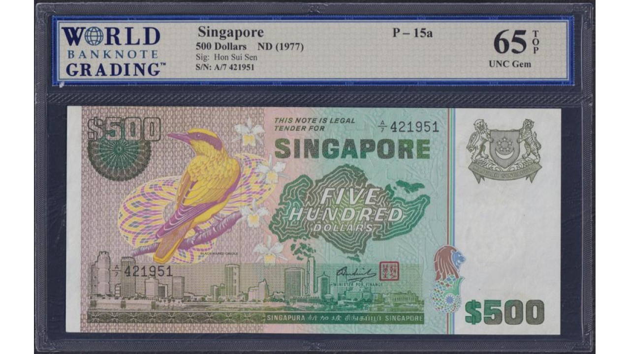 • Сингапур 500 долларов б\д (1977) А/7 421951, Редкие в состоянии UNC (Singapore 500 dollars ND (1978)) P 15a: UNC WBG 65 Uncirculated Gem TOP