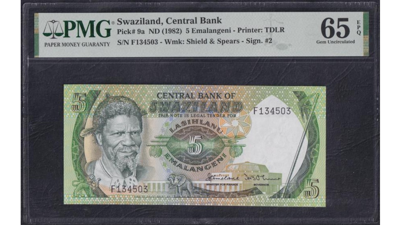 Свазиленд 5 эмалангени ND (1984), РЕДКИЕ (SWAZILAND 5 emalangeni ND (1984) P 9a: PMG 65 EPQ Gem Uncirculated
