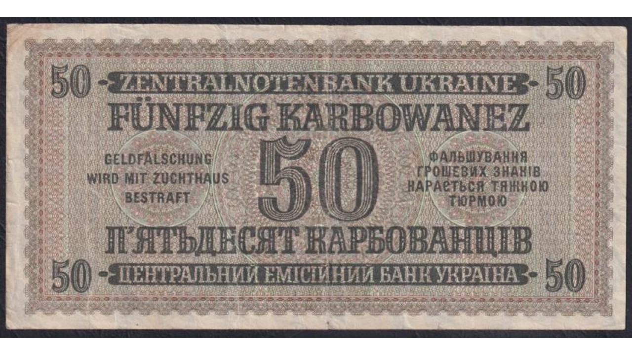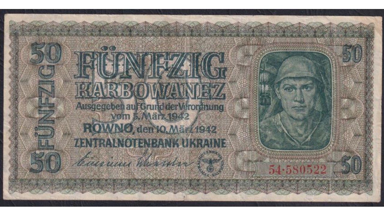 Украина СССР фашистская оккупация 50 карбованцев 1942 года, Ровно (50 Karbowanez Zentralnotenbank Ukraine 10.03.1942, ROWNO) P 54: VF/XF