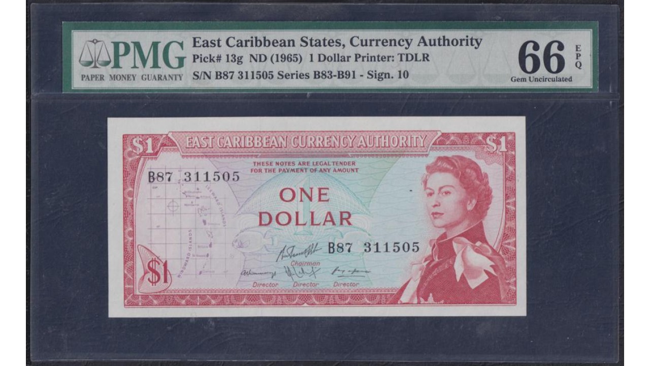• Восточные Карибские Острова 1 доллар ND (1965) (EAST CARIBBEAN STATES 1 Dollar ND (1965)) P13g: PMG 66 Gem Ucirculated EPQ