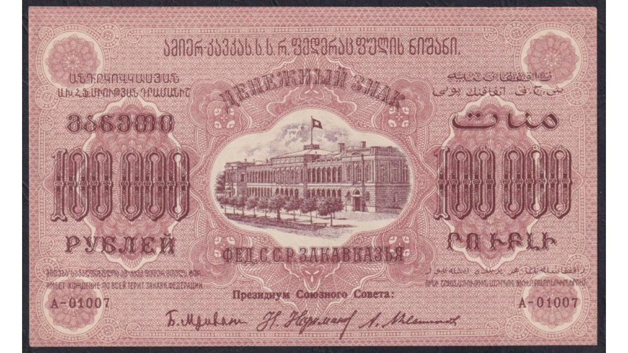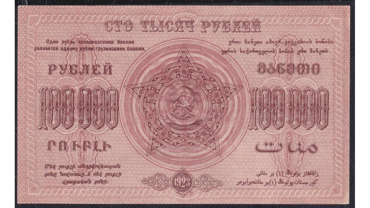 • З.С.Ф.С.Р. 100,000 рублей 1923 года, A-01007, Без В/З (Z.S.F.S.R. 250,000 roubles 1923) PS 617: UNC-