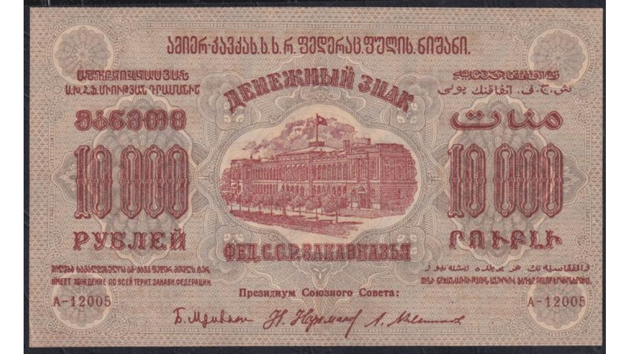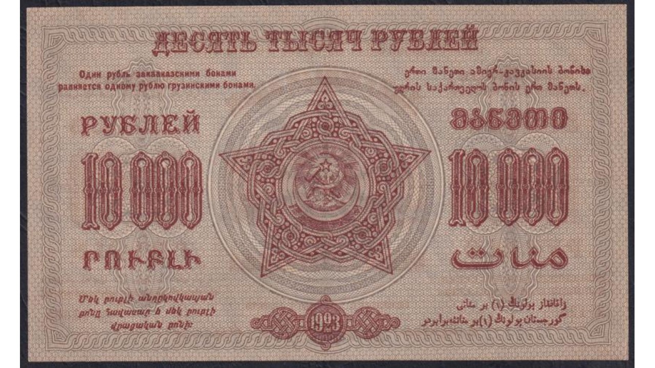 • З.С.Ф.С.Р. 10000 рублей 1923 года, A-01096, В/З Теневые Звёзды, НЕЧАСТЫЙ ЗНАК (Z.S.F.S.R. 10000 roubles 1923, Watermark: Stars) PS 624: UNC