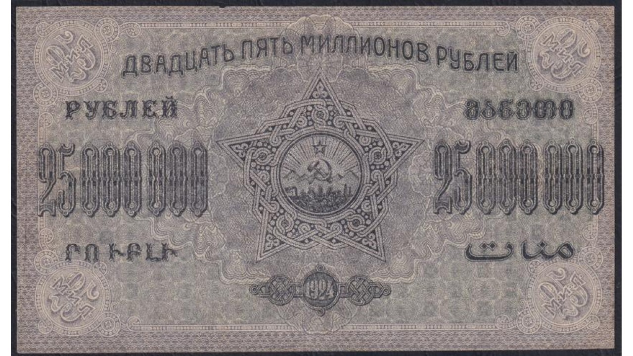 • З.С.Ф.С.Р. 25.000.000 рублей 1924 года, A-020025, В/З теневые звёзды, Нечастый Знак (Z.S.F.S.R. 25.000.000 roubles 1923, Watermark: Stars) PS 632: XF