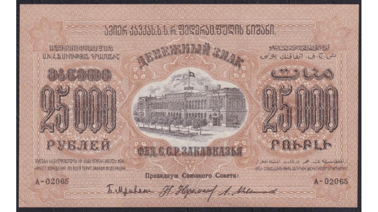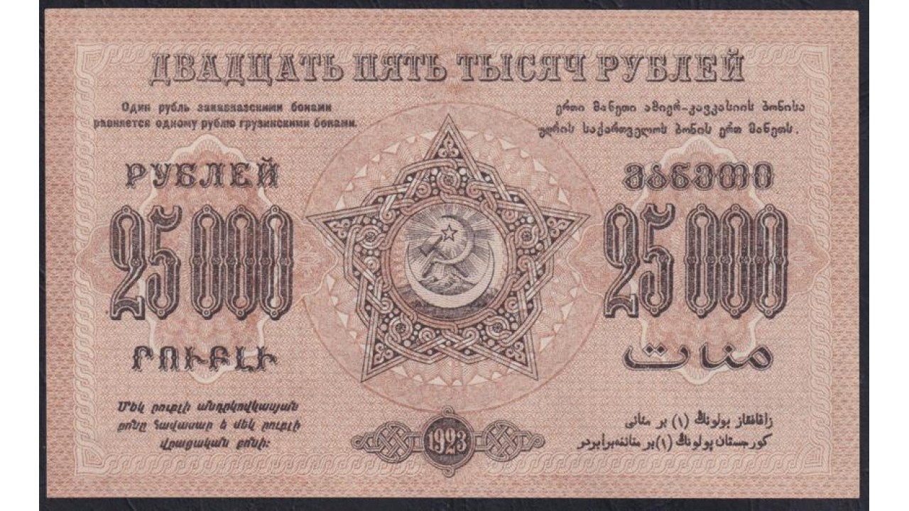 З.С.Ф.С.Р. 25000 рублей 1923 года, A-02065, Без В/З , НЕЧАСТЫЙ ЗНАК (Z.S.F.S.R. 25000 roubles 1923, Wihout Watermark) PS 615: UNC