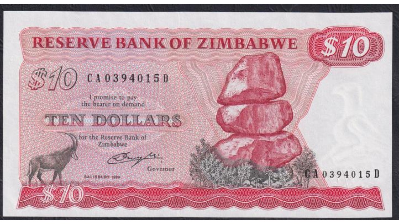 Зимбабве 10 долларов 1980 года, Солсбери (ZIMBABWE 10 dollars 1980, Solisbury) P 3a: UNC